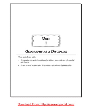 Geography integrates knowledge from natural and social sciences to study spatial variations and relationships between physical environments and human activities. It examines phenomena based on location ("where"), patterns ("what"), and causal relationships ("why") to understand interactions between nature and humans over time and space. As an integrating discipline, geography uses a holistic approach to synthesize data from fields like geology, meteorology, history, economics and sociology to comprehend different aspects of reality from a spatial perspective.