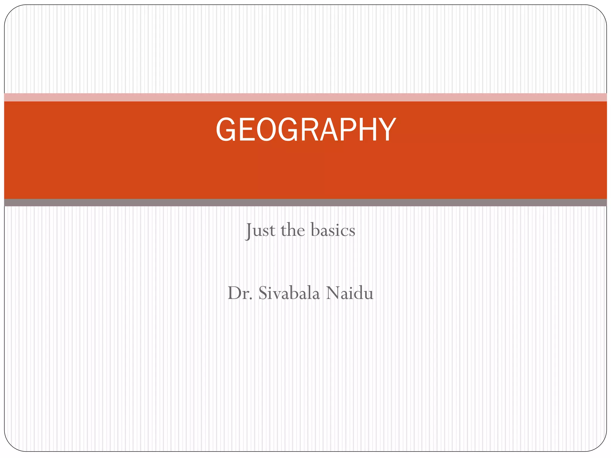 Geography consists of four academic traditions: spatial studies, area studies, human-land interaction, and an earth science perspective. It has a long history dating back to Greek geographers like Herodotus. There are six elements studied in geography: spatial terms, places and regions, physical and human systems, environment/society interactions, and applications. Geography branches into human geography (including cultural, political, urban, economic, and social studies), physical geography (landforms, soils, climate, oceans, etc.), environmental geography, and regional geography. Environmental planning considers sustainable resource use and management to balance human and natural systems.
