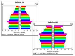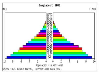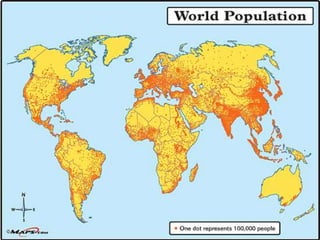 The document discusses population distribution, density, and growth, analyzing various factors affecting demographics such as natural resources and social conditions. It explores concepts including the demographic transition model, population structures, and the distinctions between different types of populations, including young, youthful, transitional, and mature populations. Additionally, it addresses migration motivations and demographics, emphasizing the impact of policies such as China's one-child policy and the challenges faced by populations in less economically developed countries.