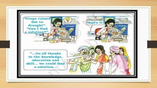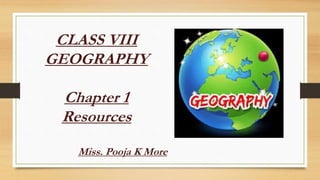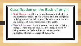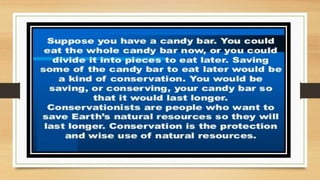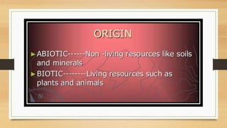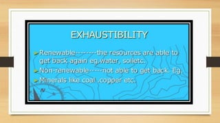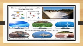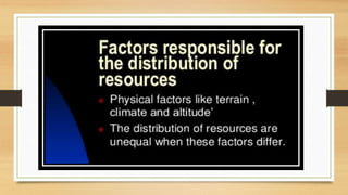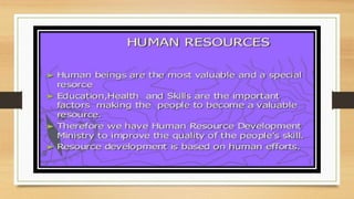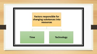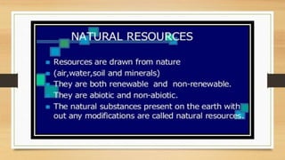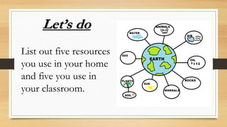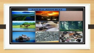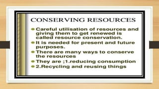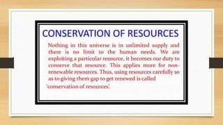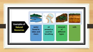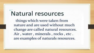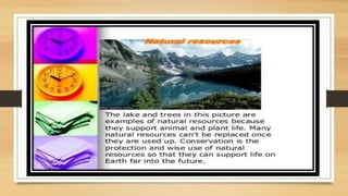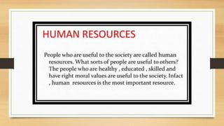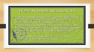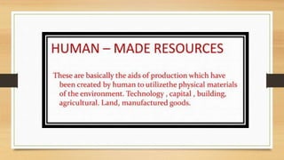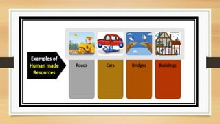 This document discusses different types of resources including natural, human-made, and human resources. It explains that natural resources come from nature and can be renewable like water or non-renewable like coal. Human-made resources are created when people use natural resources to make things like buildings and technology. People themselves are also considered a resource due to their skills and abilities. The document emphasizes the importance of conserving resources through sustainable use and development so they are available for future generations.