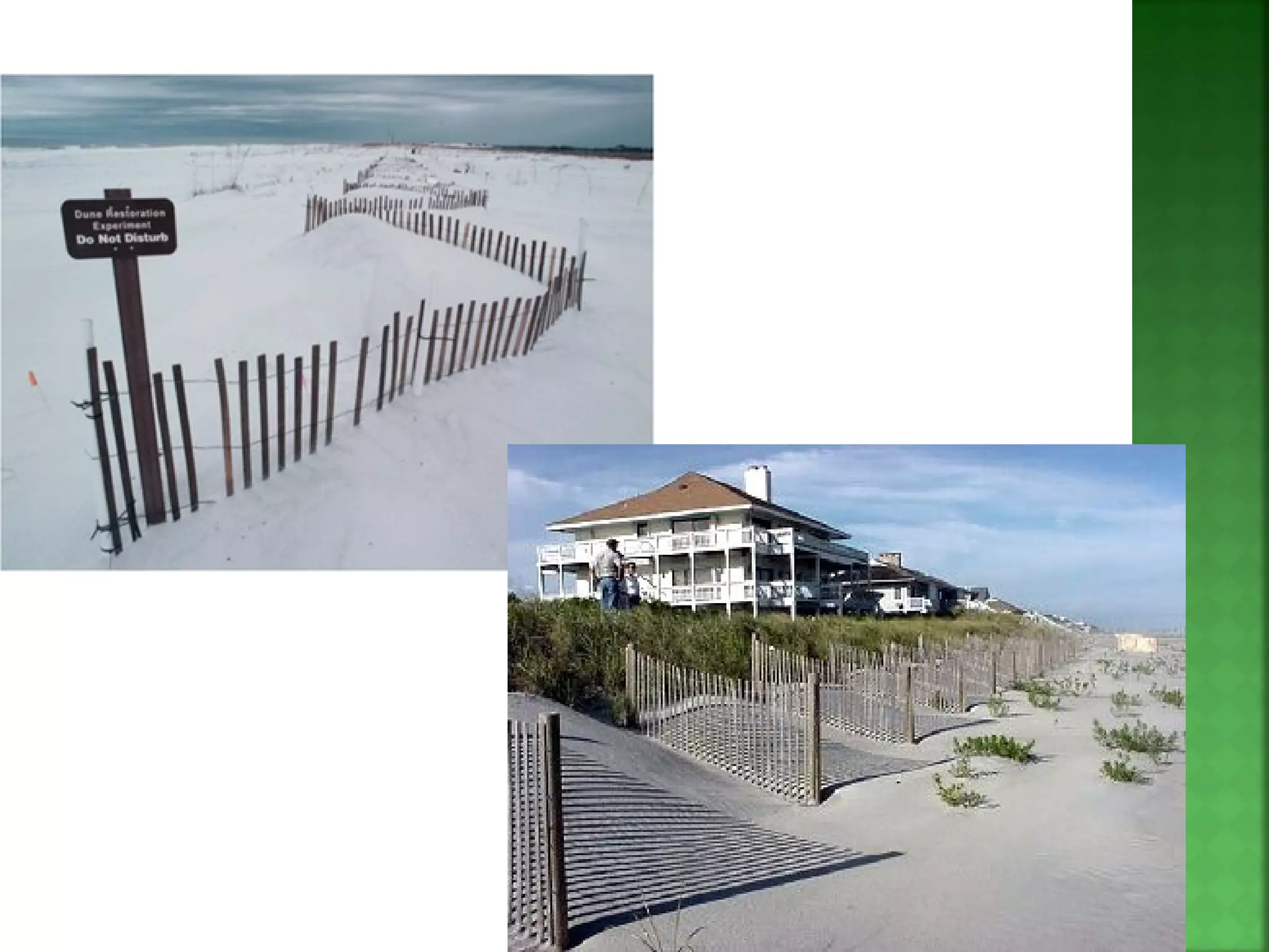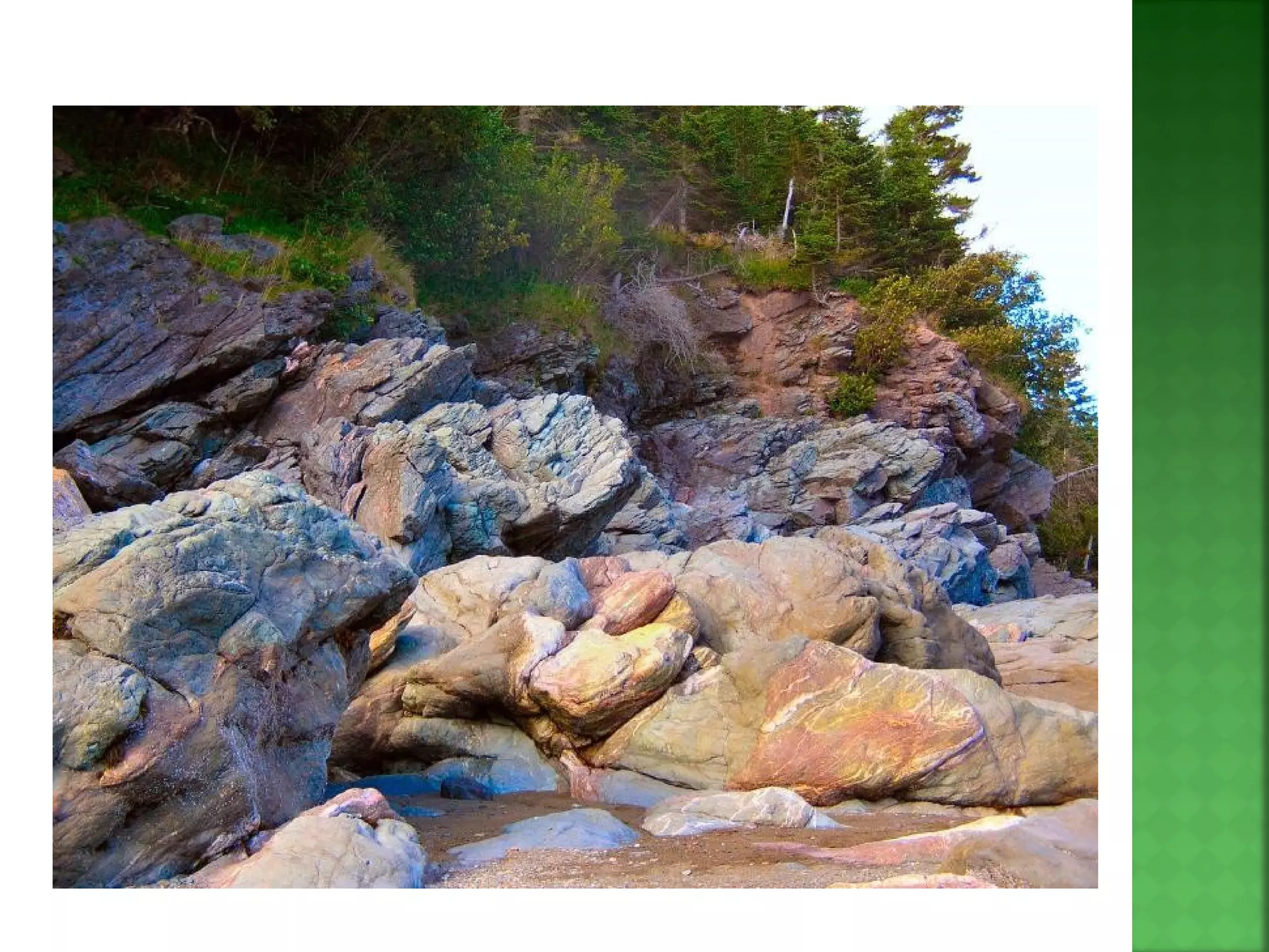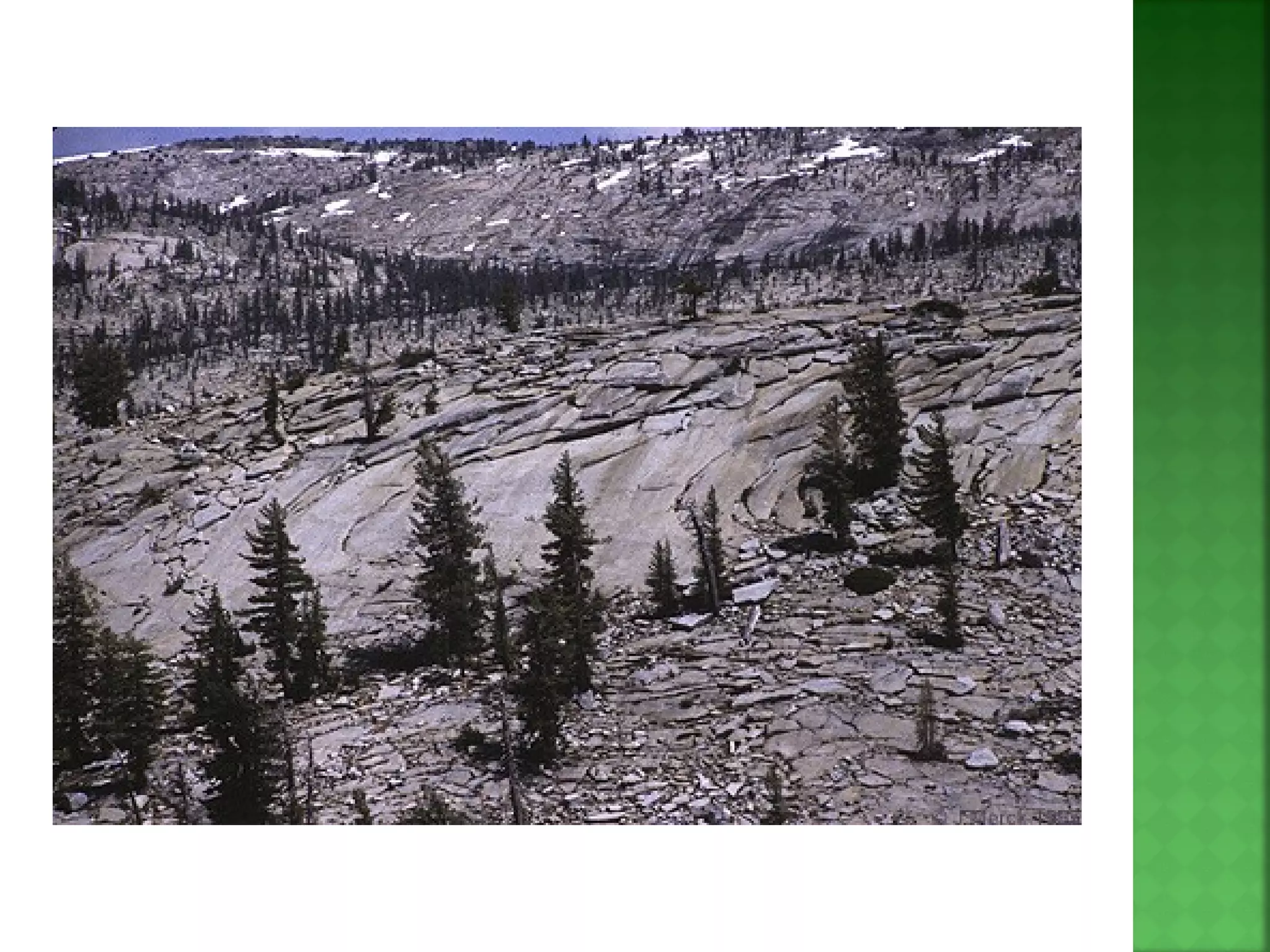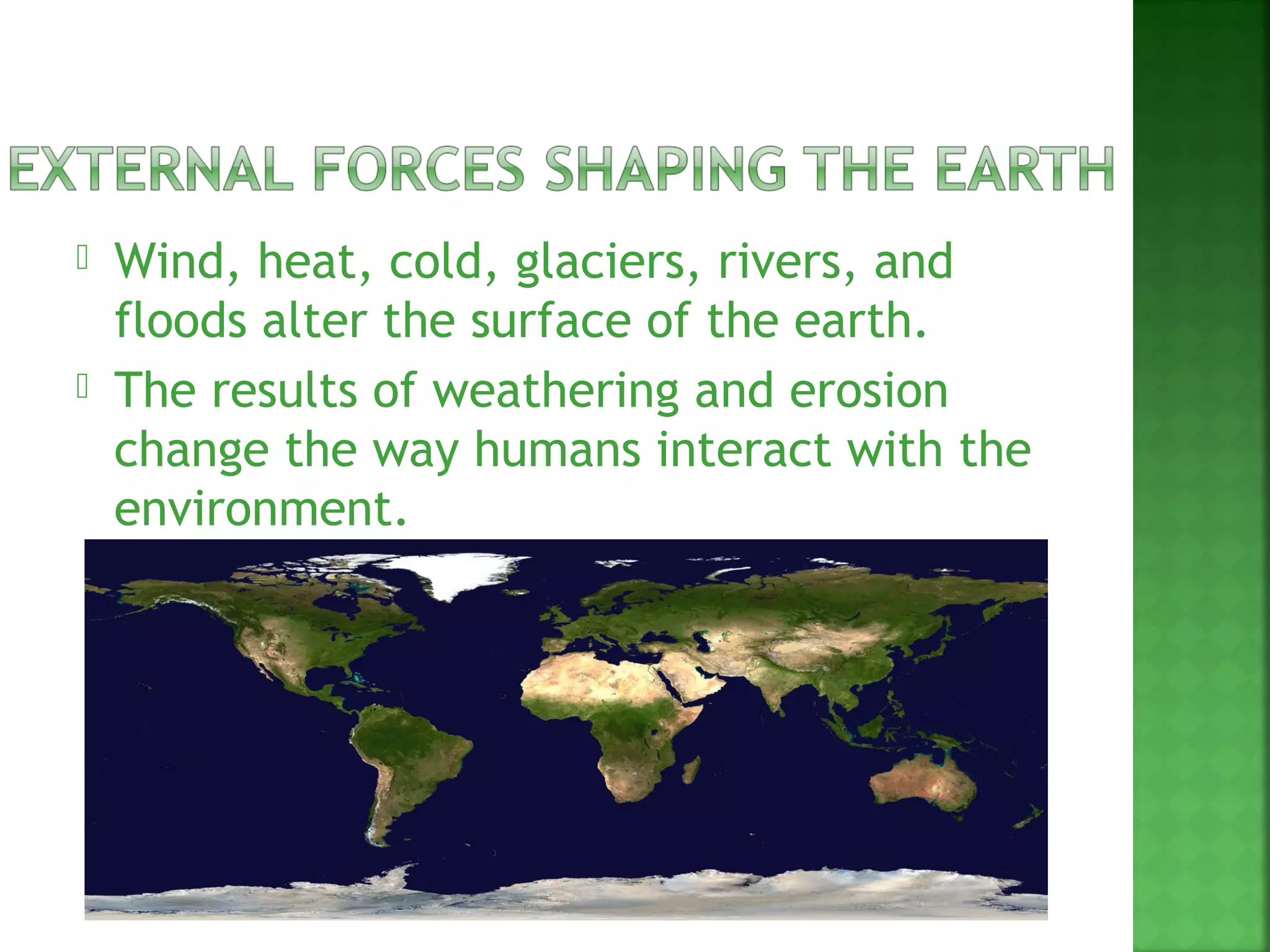 Weathering and erosion slowly alter landscapes over time through physical and chemical processes. Weathering breaks rocks into smaller pieces of sediment through mechanical and chemical breakdown without changing the rock's composition. Erosion then transports this weathered material like sediment, forming new landforms as it is deposited by forces such as wind, water, ice or gravity. These gradual changes to the earth's surface through weathering and erosion impact how humans interact with their environment.