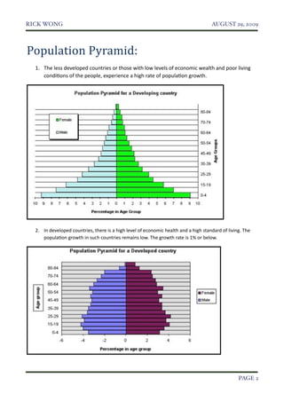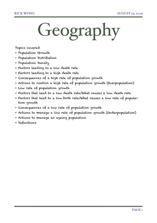 This document discusses topics related to population geography, including population growth rates, distribution, and density. It provides definitions and factors that influence high and low population growth rates. Countries with low economic development often have high growth rates due to high birth rates and low death rates. Developed countries typically have low growth rates because of low birth and death rates, attributed to factors like access to family planning, health care, and nutrition. The document also examines actions taken to control high or low growth rates and the consequences of each.