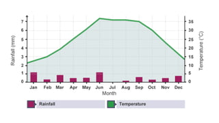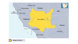 The document discusses the characteristics and challenges of desert climates, focusing on Las Vegas and the Mojave Desert. It highlights extreme temperature variations, low rainfall, survival adaptations of plants and animals, and human impacts such as urban growth and water management issues. Key problems include soil erosion, desertification, and cultural changes due to population increase and tourism.