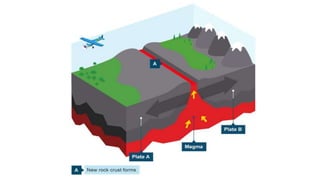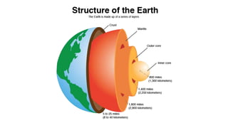 The document explains the structure of the Earth, which consists of four layers: the inner core, outer core, mantle, and crust. It describes how plate tectonics, driven by convection currents in the mantle, lead to the movement of tectonic plates and result in geological phenomena such as earthquakes and volcanoes, particularly at plate boundaries. The document also discusses the processes of constructive and destructive boundaries, leading to the formation of new crust, volcanic islands, and mountain ranges.