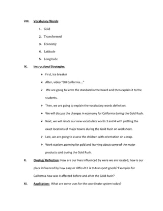 This lesson plan teaches 4th grade students about the California Gold Rush and how it transformed California's economy. Students will learn about the types of products produced during the Gold Rush, such as Levi Jeans, and how towns like Sacramento and San Francisco grew. Students will also learn to use latitude and longitude to locate major Gold Rush towns on maps of California. The lesson incorporates activities like panning for gold and identifying important places and travel routes from the Gold Rush era.