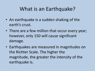Earthquakes are caused by the movement of tectonic plates. They occur most frequently along plate boundaries. The magnitude of an earthquake is measured on the Richter scale, with higher magnitudes indicating more intense shaking. Earthquakes endanger human lives and cause extensive damage to structures and infrastructure. They disrupt vital systems and can damage economies. Haiti's 2010 earthquake which killed over 250,000 people and left 1.2 million homeless is a prime example of the devastating human and economic impacts of a major seismic event. Proper building codes and preparedness measures can help mitigate earthquake hazards.