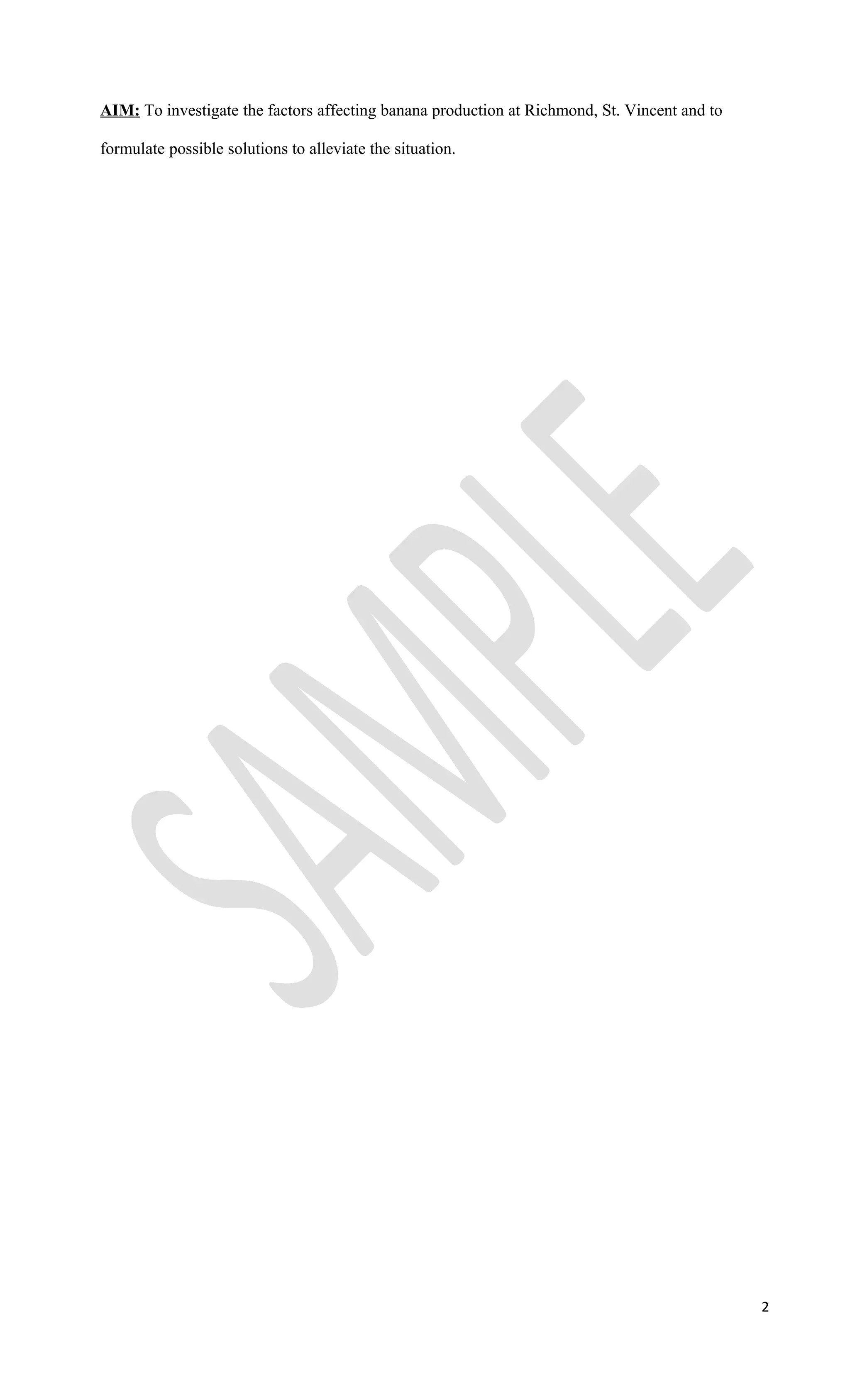 The document summarizes a geography student's research project on factors affecting banana production in Richmond, St. Vincent. The student conducted a questionnaire with 20 banana farmers to investigate factors like diseases, finances, and government assistance. Key findings include: most farmers were over 27 years old with primary education; the most cited disease was Black Sigatoka but some farmers lacked knowledge of disease dangers; many farmers lacked sufficient finances but felt government assistance for disease control was limited; suggested solutions included more effective disease control, extension officers, transportation assistance, and credit/attention for farmers.