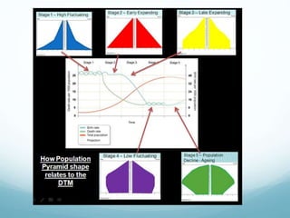 The document discusses the characteristics and impacts of aging populations. It notes that aging populations have more people over 65 than under due to lower birth rates and increased life expectancy. This puts pressure on economies and social systems as the proportion of dependents increases. The elderly require more healthcare and pensions, raising taxes on the working population. Fewer workers also slow economic growth. Population pyramids and the Demographic Transition Model are used to analyze population structures and trends over time.