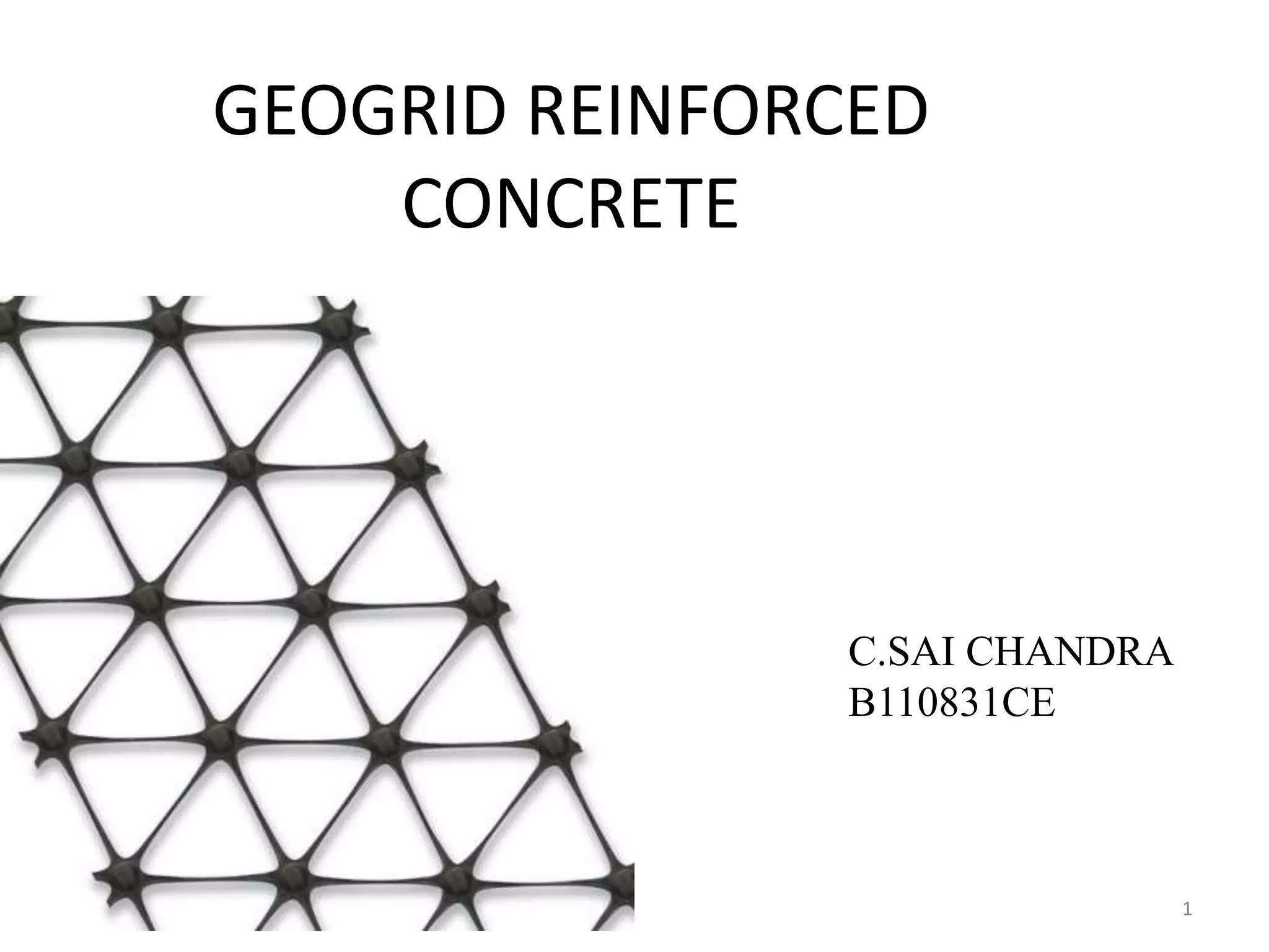 1) The document discusses the use of geogrid reinforcement in concrete. Geogrids are made of polymer materials and have a grid-like pattern that can interlock with aggregates to improve the properties of concrete.