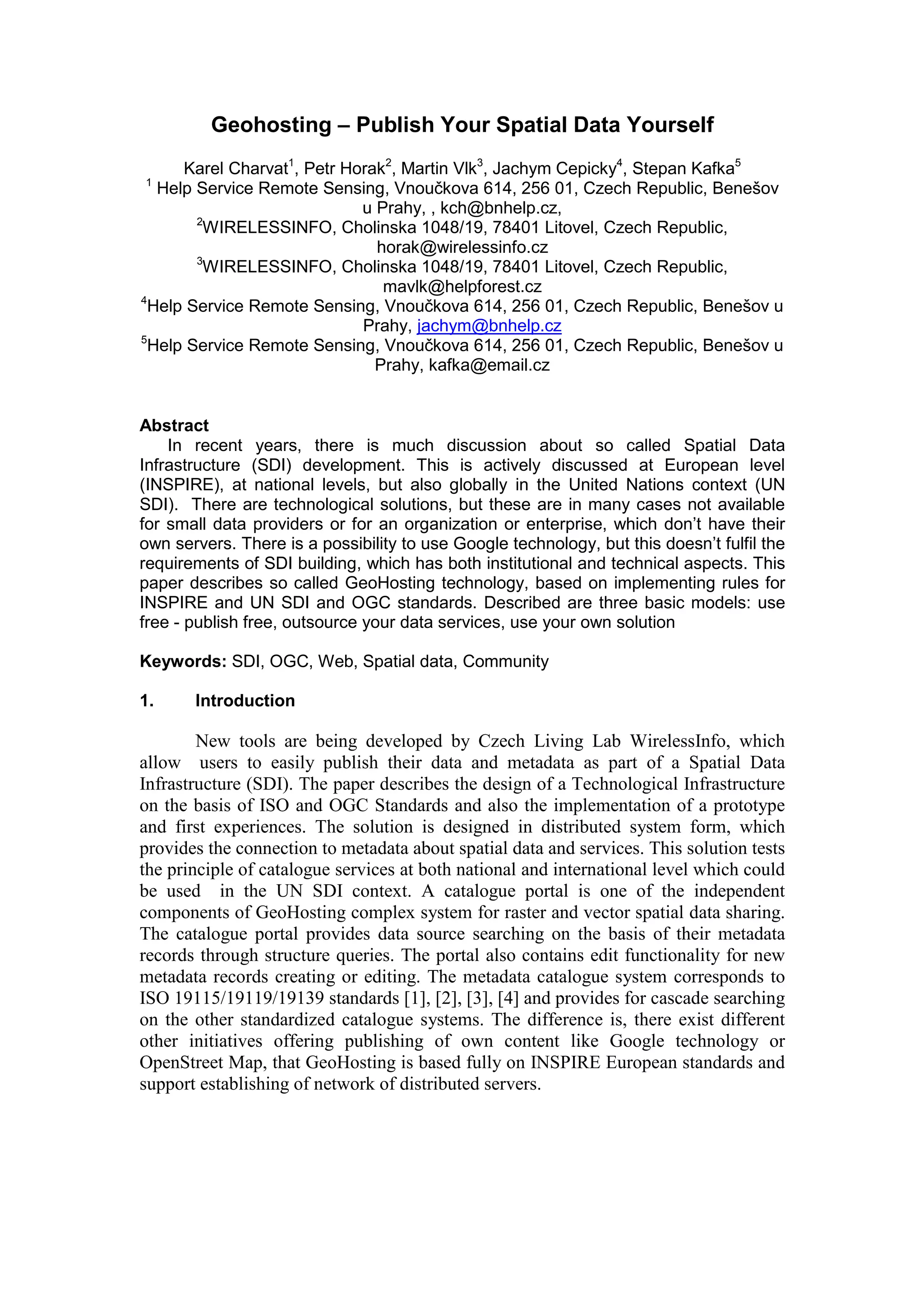 The document discusses the development of geohosting technology for facilitating spatial data sharing and publication, particularly for small data providers and developing countries. It describes a system designed based on ISO and OGC standards, providing a catalogue for metadata and tools for managing and visualizing geospatial data. The project aims to improve access to geo-spatial information through user-friendly, open technologies while supporting international initiatives for spatial data infrastructure.