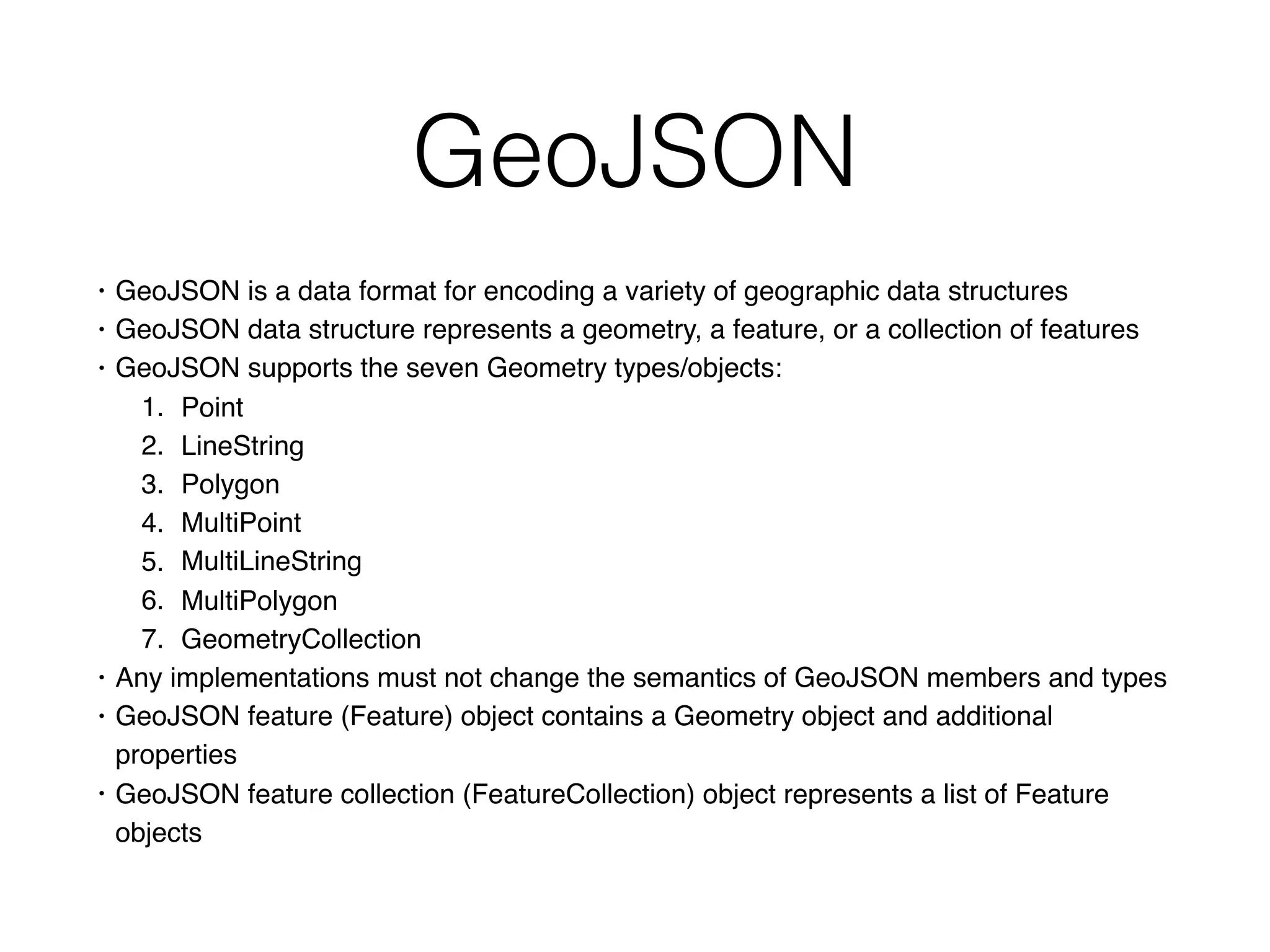 GeoJSON is a format for encoding geographic data structures, including various geometry types such as points, lines, and polygons. It consists of geoJSON objects that represent features or feature collections, containing members like 'type,' 'geometry,' and 'properties.' Additionally, it supports bounding boxes to provide spatial context for geographic datasets.