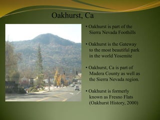 This document is a geology field assignment that explores the Oakhurst, California region. It discusses the geology, plants, animals and human history of the area. Oakhurst is located in the Sierra Nevada foothills and is a gateway to Yosemite National Park. The document describes the various rock types found in the region like igneous, sedimentary and metamorphic rocks. It also summarizes the plant and animal life, including trees, deer, and mountain lions. Finally, it discusses the native peoples who originally inhabited the area and how the landscape has changed over time.