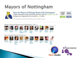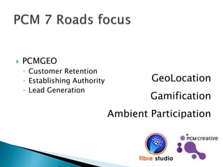 The document discusses the integration of gamification and geolocation in enhancing customer engagement and retention through various interactive techniques and applications. It highlights the impact of these strategies on user behavior, noting a significant increase in task completion rates when gamification is applied. Additionally, it raises concerns about privacy and identity while showcasing platforms like Gowalla and Foursquare that utilize these concepts.