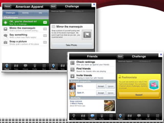 SoLoMo refers to social, local, and mobile technologies that combine geosocial networking and geolocation. These platforms allow users to check-in and share their locations, discover local businesses and events, and connect with other users nearby. Popular examples include Foursquare, Facebook Places, and Groupon, which businesses can use to target promotions at local customers, build loyalty, and increase sales. However, challenges remain in motivating large portions of the population to participate and addressing privacy concerns.