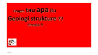 Dokumen ini menjelaskan pengenalan geologi, termasuk struktur batuan, pengukuran kedalaman, dan berbagai istilah geologi seperti kekar, sesar, dan lipatan. Terdapat juga pemaparan tentang metodologi statistik dalam menganalisis data geologi. Informasi disampaikan dalam bentuk klasifikasi dan penjelasan yang terstruktur.