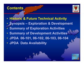This document provides a technical overview of petroleum exploration and development activities in the Joint Petroleum Development Area (JPDA) between Timor-Leste and Australia. It summarizes that over 50,000 km of seismic data and 46 wells have been drilled, leading to 9 significant oil and gas discoveries. The Bayu-Undan gas field has been producing since 2004 via a gas recycling project and pipeline to Darwin, while other fields like Elang-Kakatua-Kakatua North have also seen production. Four blocks are currently being promoted for new exploration, with proven petroleum systems and existing seismic data but many remaining untested structures.