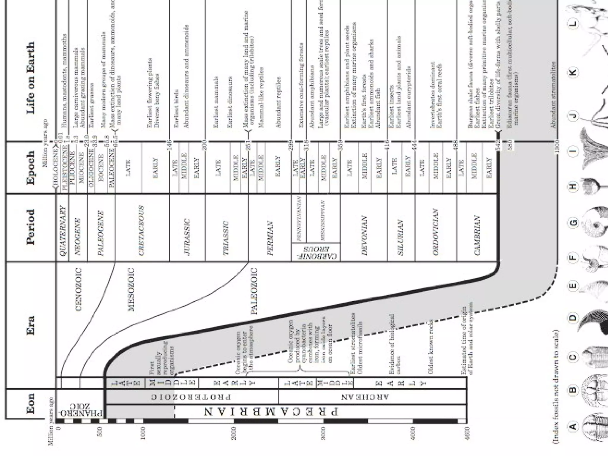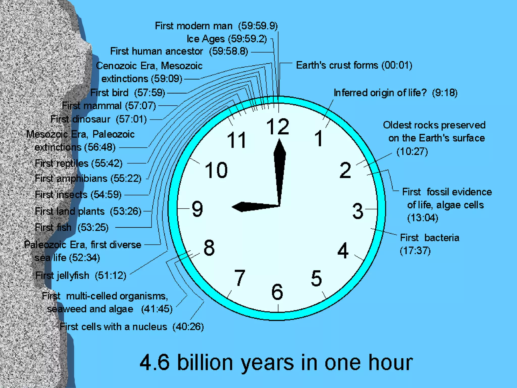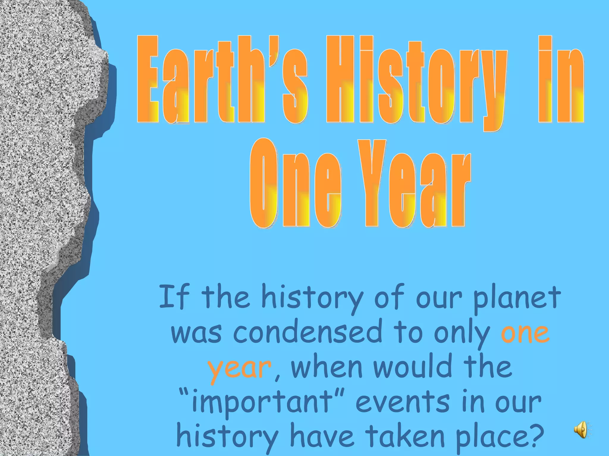 The document summarizes Earth's geologic history condensed into one calendar year. Key events include: