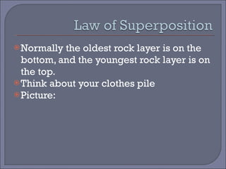 The document discusses three geological principles: the Law of Superposition states that in an undisturbed sequence of rock strata, older rocks will be below younger rocks; the Law of Original Horizontality states that sedimentary rocks are deposited in horizontal layers; and the Law of Uniformitarianism asserts that the geological processes observed in the present have operated throughout Earth's history in a similar manner and intensity.
