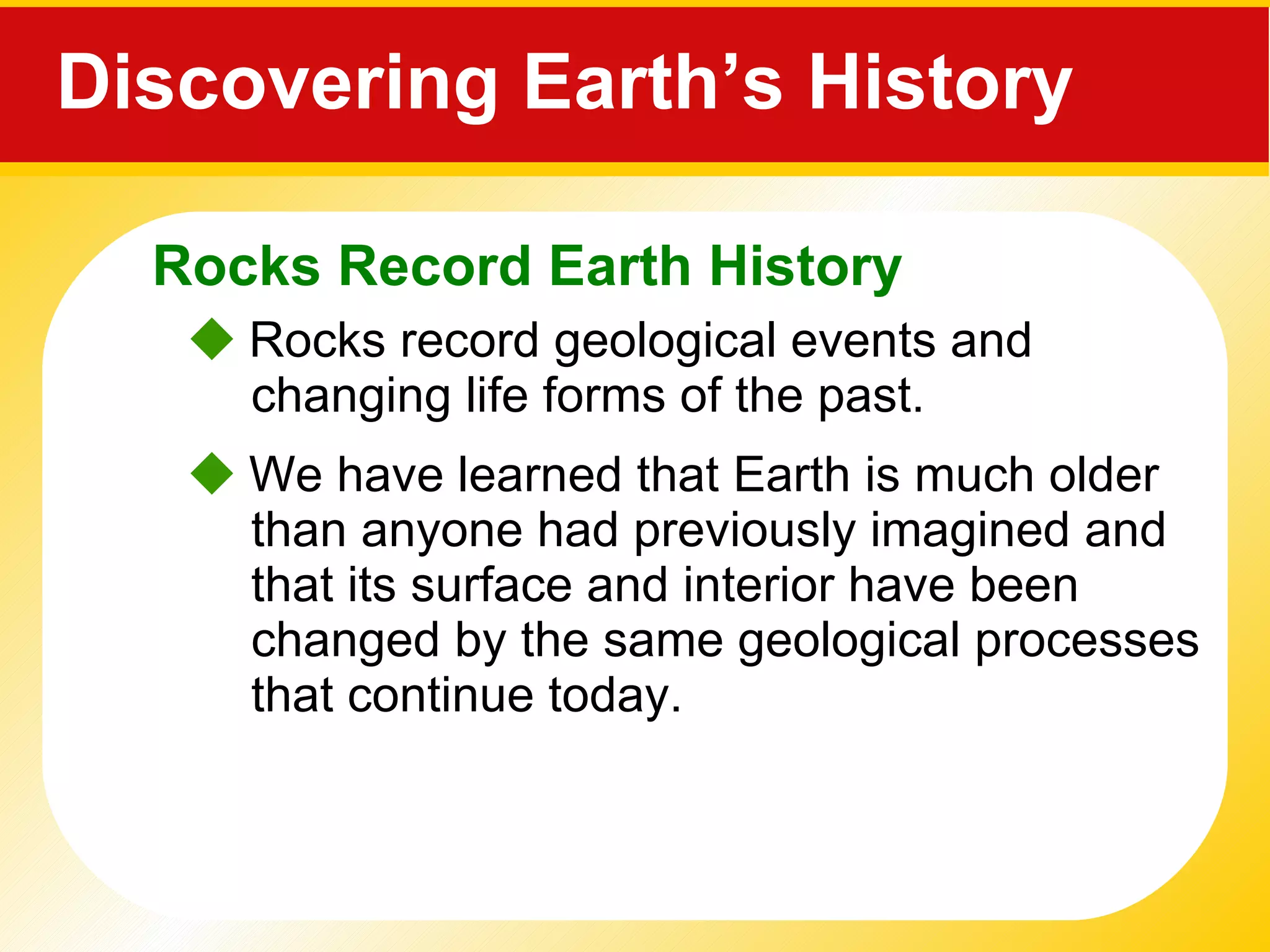 The document discusses how geologists use rocks and fossils to understand Earth's history. Rock layers and fossils provide evidence about past life forms and environmental conditions. By analyzing things like rock formations, unconformities, and the fossils contained within rocks, geologists have learned that Earth is much older than previously believed and has undergone geological changes over long periods of time. Radiometric dating techniques also allow geologists to estimate the age of rocks and events in Earth's history.