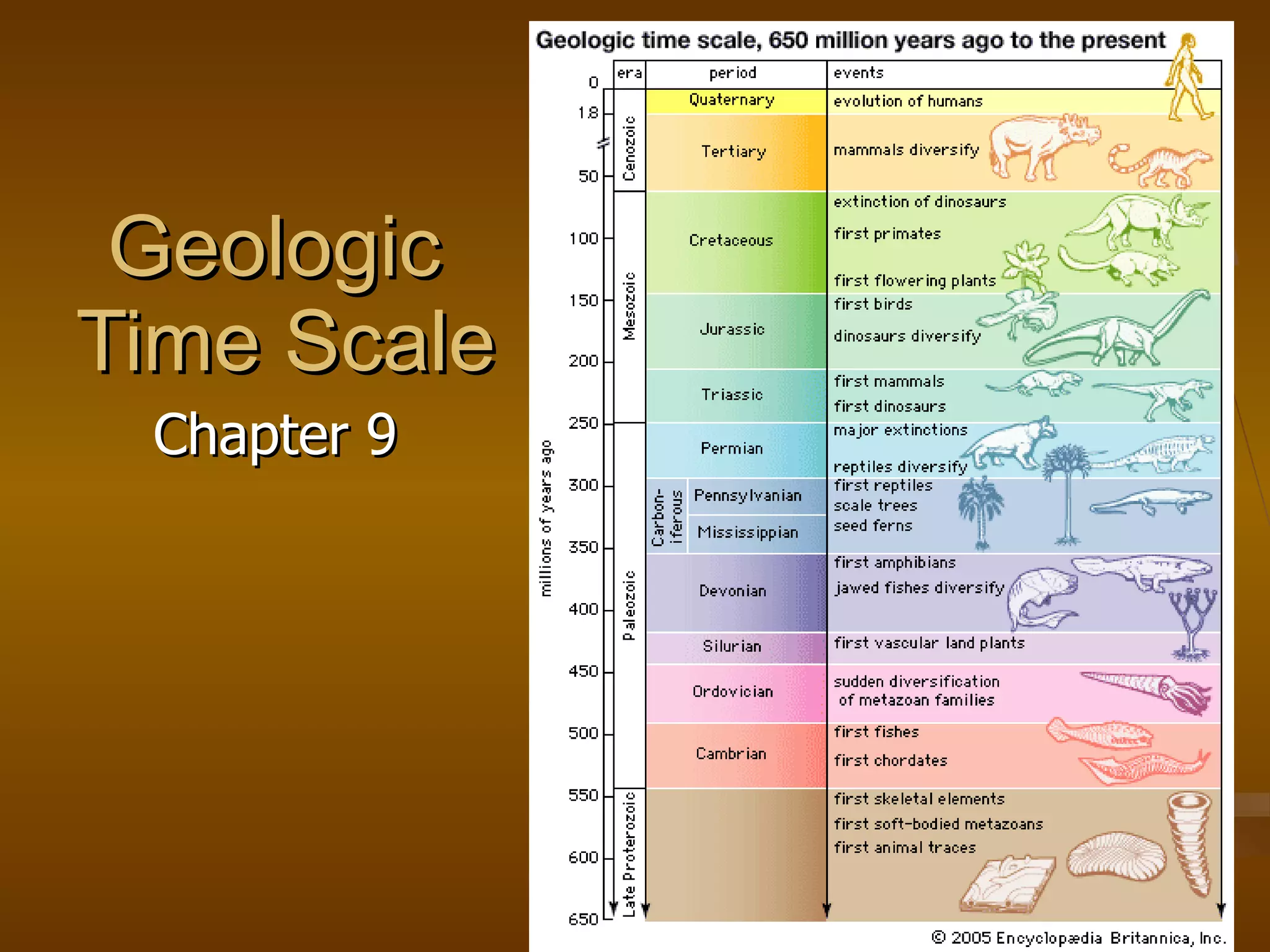 The document divides Earth's geologic history into a time scale consisting of eons, eras, periods, and epochs. Major changes in lifeforms or the environment define the boundaries between these divisions. The Precambrian era spanned from Earth's formation 4.6 billion years ago until 542 million years ago and saw the emergence of early prokaryotic and then eukaryotic life. Mass extinctions, such as those at the ends of the Paleozoic and Mesozoic eras, were often caused by catastrophic asteroid impacts or climate change and marked transitions between eras.