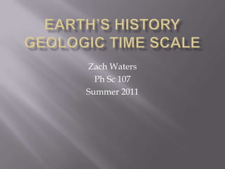 The document summarizes Earth's geologic history from its formation 4.6 billion years ago to the present. It is divided into eons, eras, periods, and epochs. The earliest eons included the Hadean and Archean, when Earth was molten and the first life formed. The Proterozoic saw continued formation of continents and oxygen buildup. The Phanerozoic eon saw the rise of complex life, including during the Paleozoic era of the Cambrian, Ordovician, and other periods. During the Mesozoic era, life included dinosaurs and the breakup of Pangaea. The Cenozoic era is the current one including the C