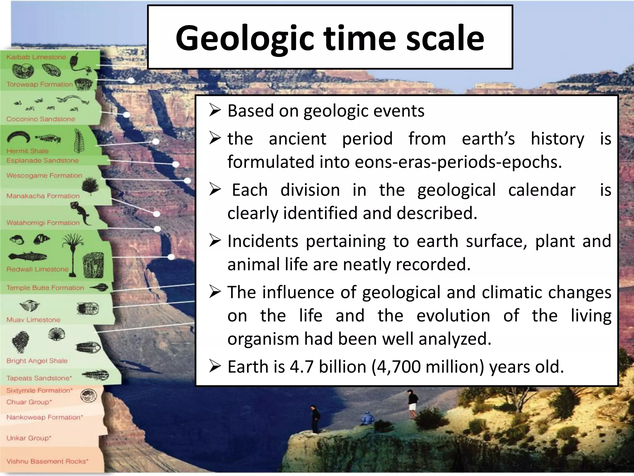 The document outlines the geologic time scale which divides Earth's history into standardized eon, era, period, and epoch units. It describes the major events that occurred during each period such as the emergence of life, evolution of plants and animals, mass extinction events, and more. The geologic time scale is based on analyzing the fossil record and dating the ages of rocks and sediments to correlate transitions in life forms with absolute time.