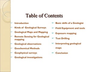 This document outlines the methods and practices involved in geological surveys and mapping, covering topics such as geochemical and geophysical surveys, remote sensing, and the skills required for a geologist. It emphasizes the importance of geological mapping for resource exploration, safety, and environmental considerations, and details the necessary equipment for effective fieldwork. The document serves as a comprehensive guide for students and professionals in earth sciences to understand geological mapping techniques and their applications.