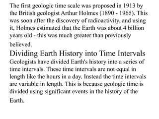 - The first geologic time scale was proposed in 1913 by British geologist Arthur Holmes, estimating Earth's age at around 4 billion years old, much older than previously believed.