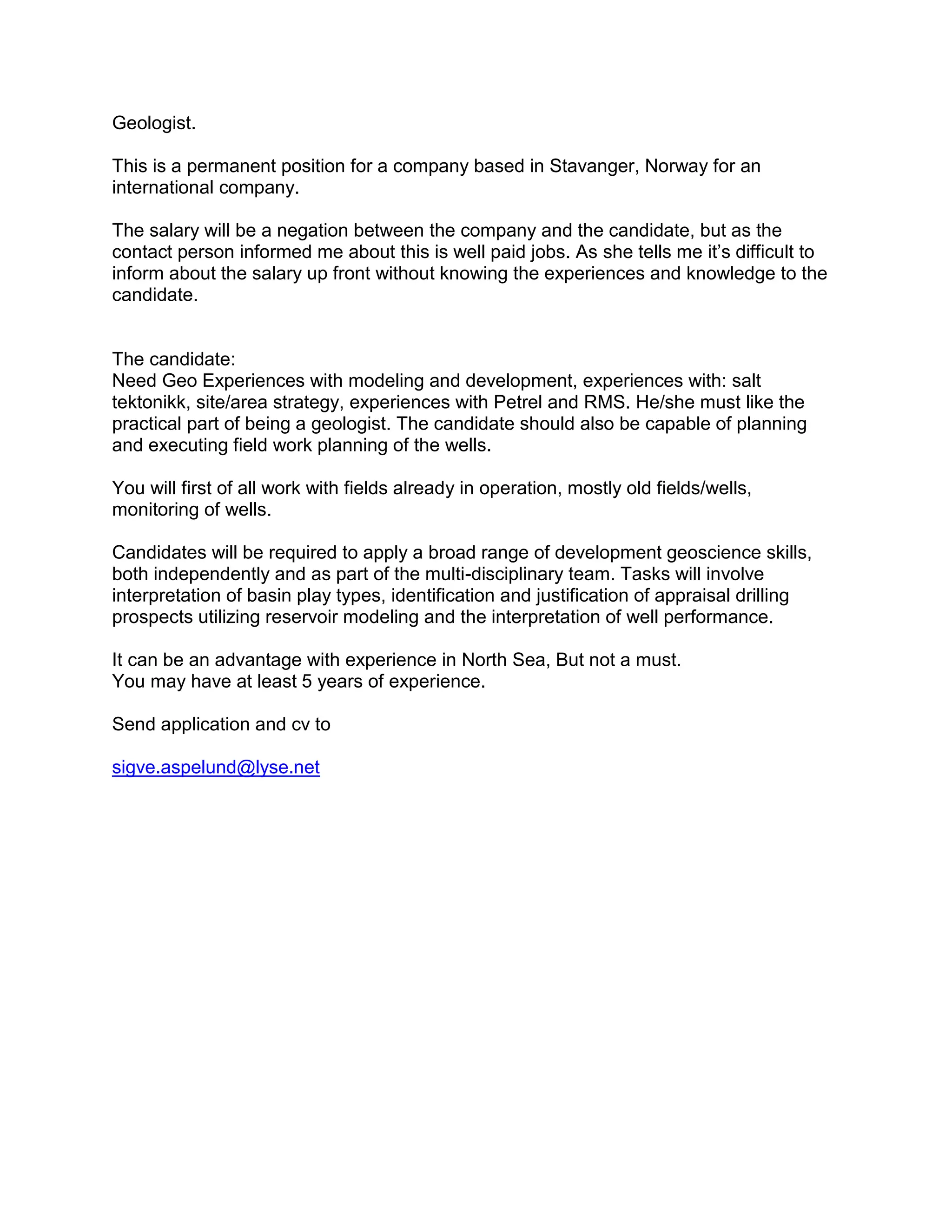 This job posting is for a permanent geologist position with an international oil and gas company based in Stavanger, Norway. The salary will be negotiated based on experience and qualifications. The ideal candidate will have 5+ years of experience modeling salt tectonics and site/area strategy using Petrel and RMS software. Daily responsibilities will include monitoring existing oil fields, interpreting basin plays, and identifying new drilling prospects through reservoir modeling and well performance analysis. Experience in the North Sea is preferred but not required.