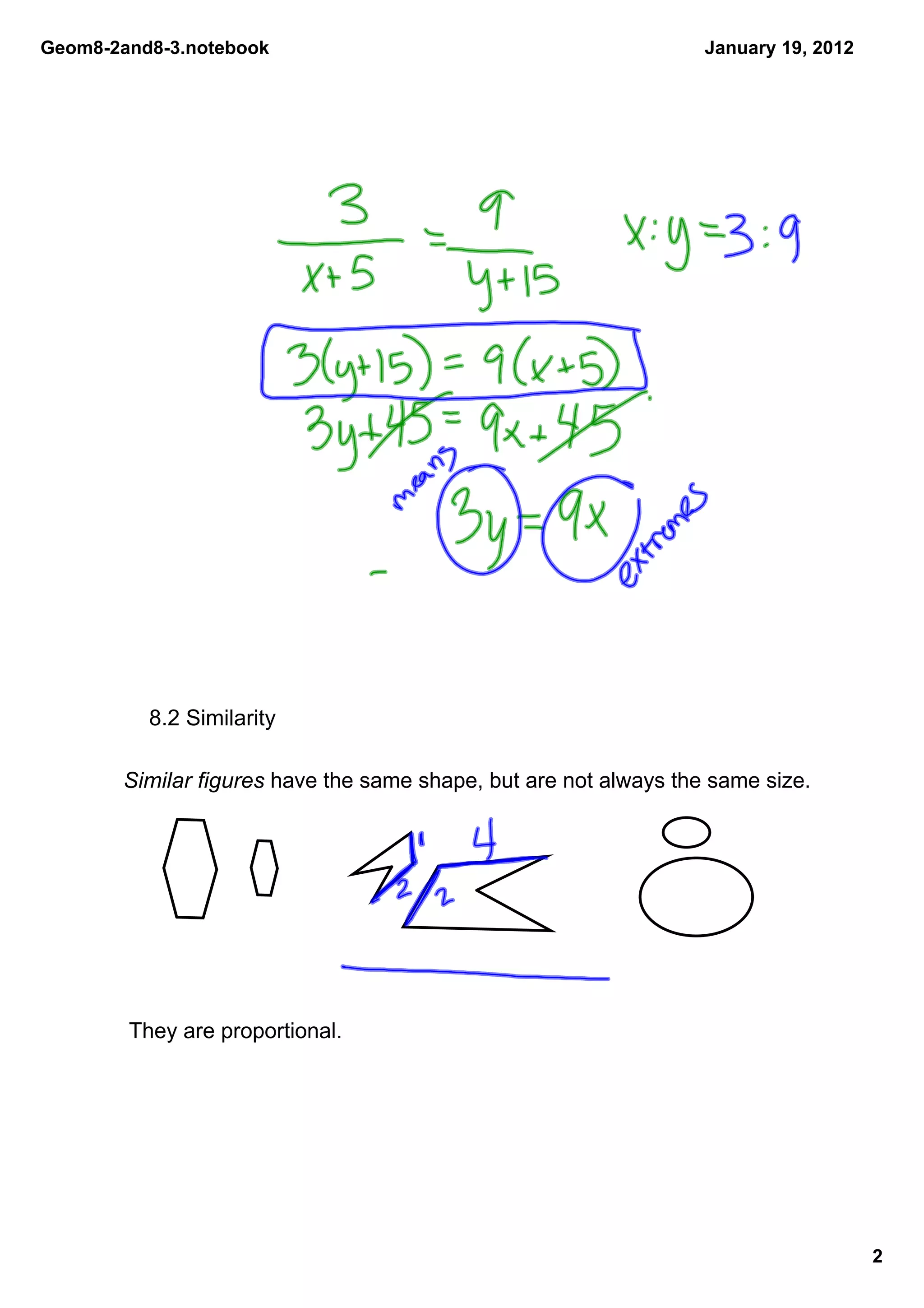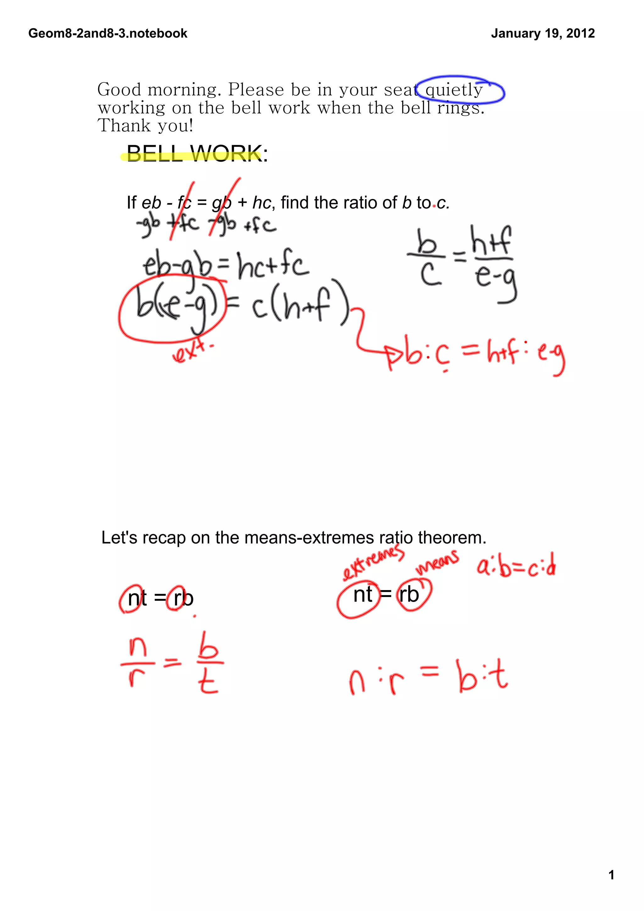 This document contains notes from a geometry class. It begins with instructions for bell work and then discusses similarity of figures. It defines similar polygons as having proportional corresponding sides and congruent corresponding angles. It states the ratio of perimeters of similar polygons equals the ratio of corresponding sides. The document then discusses methods to prove triangles similar, including AAA, AA, SSS, and SAS. It assigns homework problems from the textbook and worksheet to be due the next class.