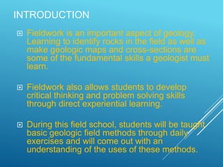 This document discusses geological mapping and its application in engineering geology. It begins by explaining that the purpose of geological field mapping is to make a geological description of an area and collect rock samples. It describes the various types of data collected during mapping and how it should be presented. The document then discusses different types of geological maps and the tools and techniques used for mapping, including measuring strike, dip, and constructing geological cross-sections. Safety considerations for fieldwork are also covered.