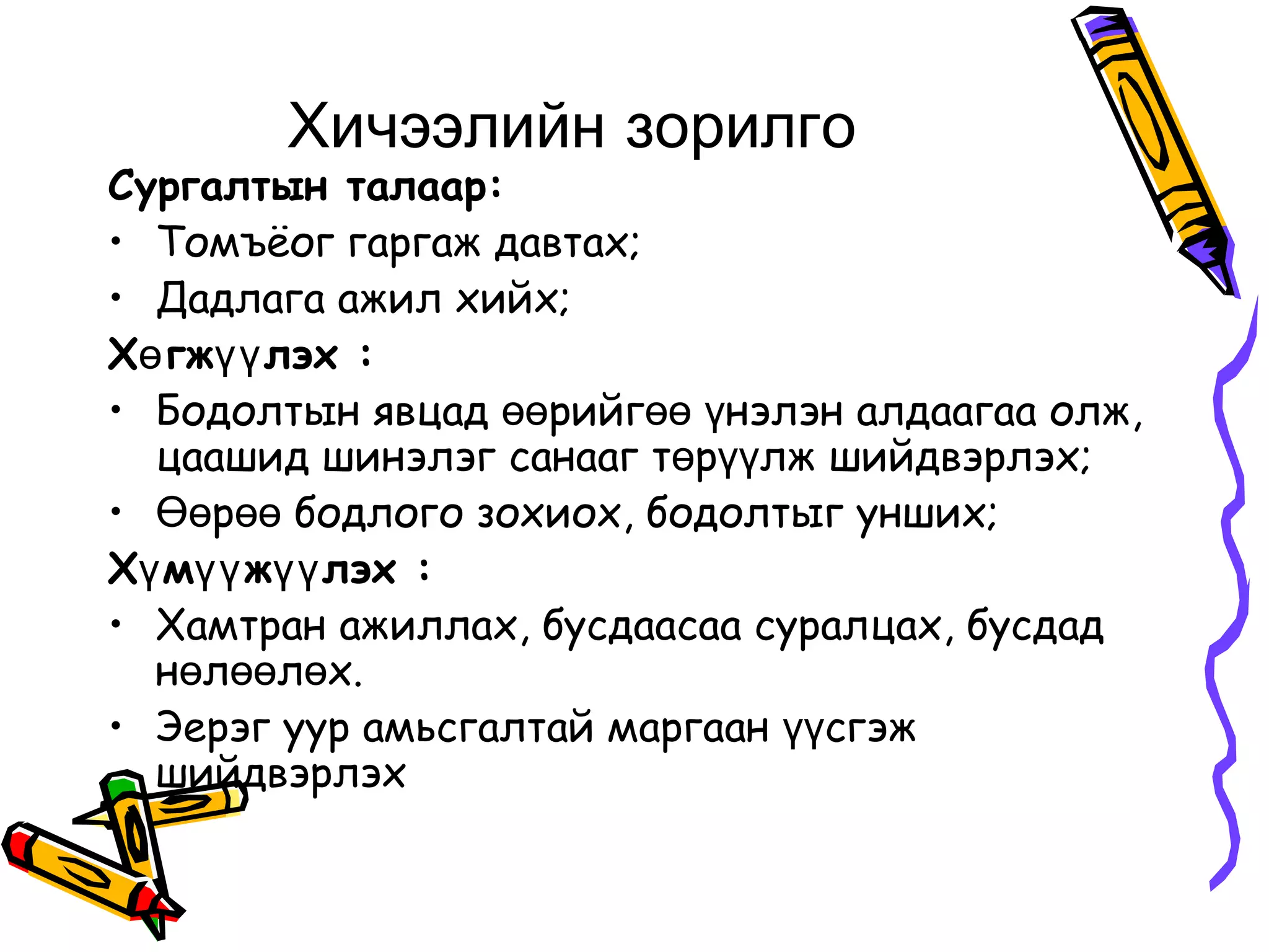 • Өөрөө бодлого зохиох, бодолтыг унших;