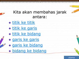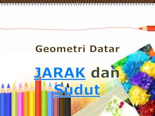 1. Dokumen tersebut membahas berbagai jenis jarak pada bangun ruang seperti jarak titik ke titik, titik ke garis, titik ke bidang, garis ke garis, garis ke bidang, bidang ke bidang, dan sudut antara dua garis, garis dan bidang, serta bidang dan bidang.
