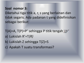 Dokumen ini membahas transformasi pada tiga titik yang tidak segaris dan menyajikan bukti bahwa fungsi padanan t adalah bijektif, sehingga memenuhi syarat untuk menjadi transformasi. Melalui gambar dan penjelasan, dibuktikan bahwa t adalah fungsi surjektif dan injektif. Kesimpulannya, t dapat dianggap sebagai suatu transformasi.