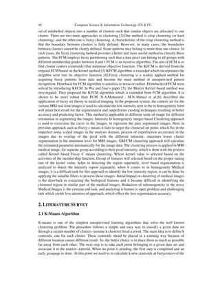 The document presents a new Gaussian Kernel-based Fuzzy C-Means Clustering algorithm (GKFCM) for image segmentation, aimed at improving accuracy in segmenting noisy images, particularly in medical applications like tumor detection. GKFCM extends the traditional fuzzy c-means algorithm by incorporating kernel methods and neighbor information to enhance noise insensitivity and detail preservation in image processing. The primary goal of this research is to provide better segmentation results for images with intensity inhomogeneity, thus offering significant advantages over existing methods.