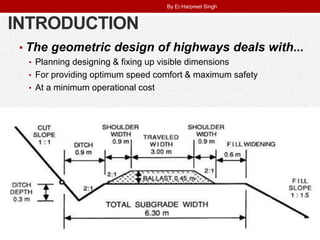 The document discusses the geometric design of highways. It covers key elements like cross-section design, horizontal and vertical alignment, sight distance considerations. Factors affecting design like design speed, traffic, and topography are also covered. Elements of cross-section like carriageway, formation width, and right of way are described. Horizontal alignment includes design of super elevation, transition curves, and setback distance. Sight distance standards for stopping, overtaking are provided.