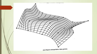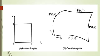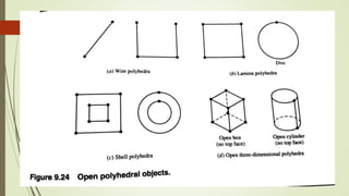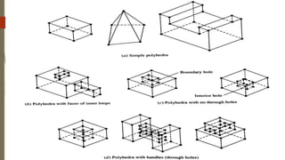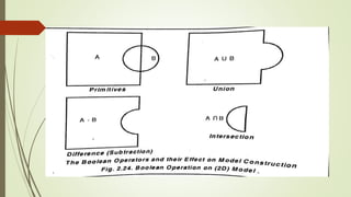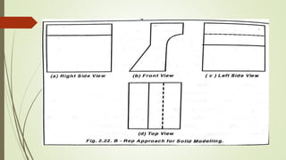 Geometric modeling uses software to mathematically describe an object's geometry. There are three main methods: wireframe modeling represents edges as lines; surface modeling depicts objects' surfaces clearly but provides no interior data; and solid modeling displays whole solids realistically without misinterpretation risk. Boundary representation is a popular solid modeling technique where views are sketched and connected via lines. Constructive solid geometry also constructs solids using primitives combined through Boolean operations.