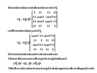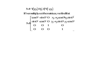 OpenGL uses model-view and projection matrices to apply transformations like translation, rotation, and scaling. The document discusses constructing transformation matrices for different types of transformations, including translation, rotation around fixed points and arbitrary axes, scaling, and shearing. It also covers combining multiple transformations using matrix multiplication and storing transformations in the current transformation matrix.