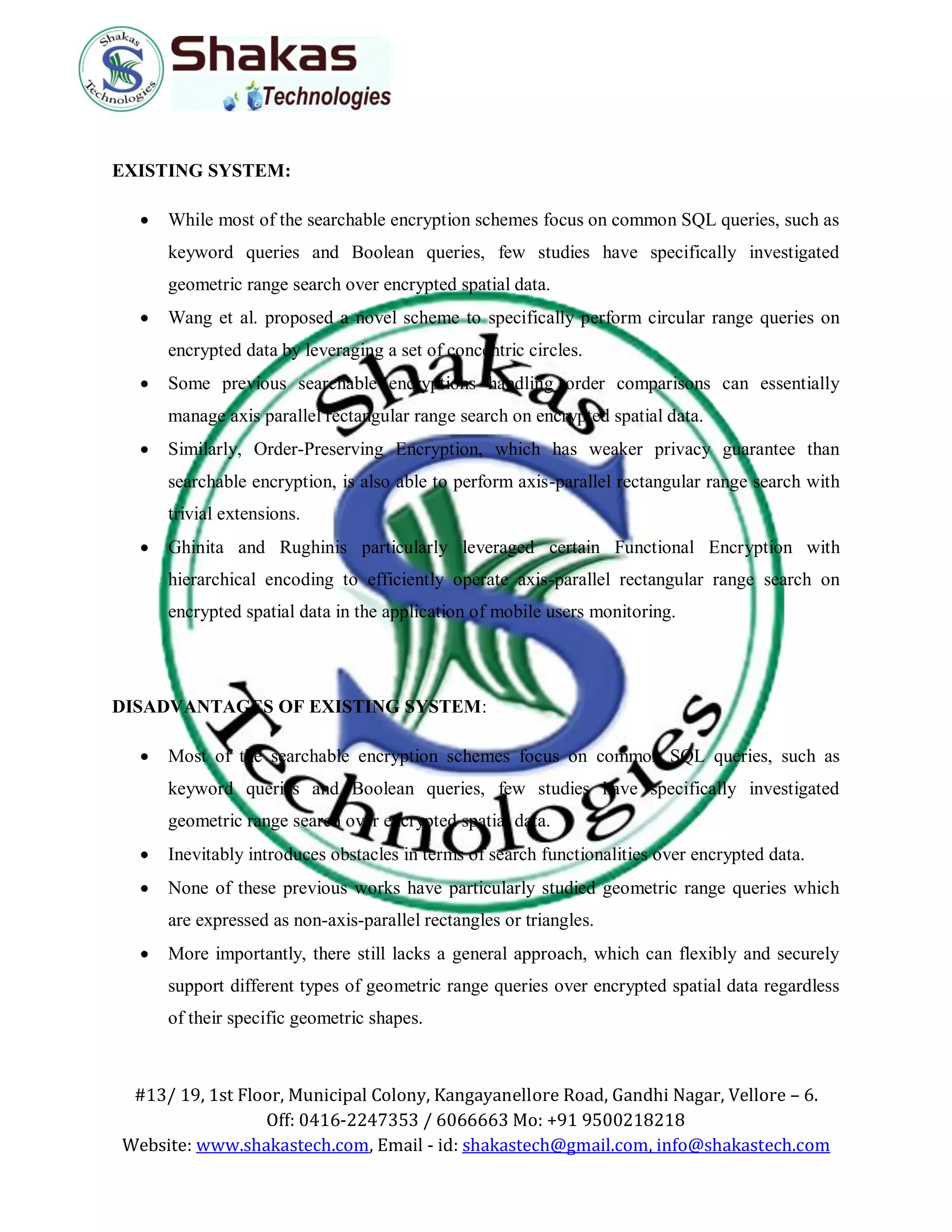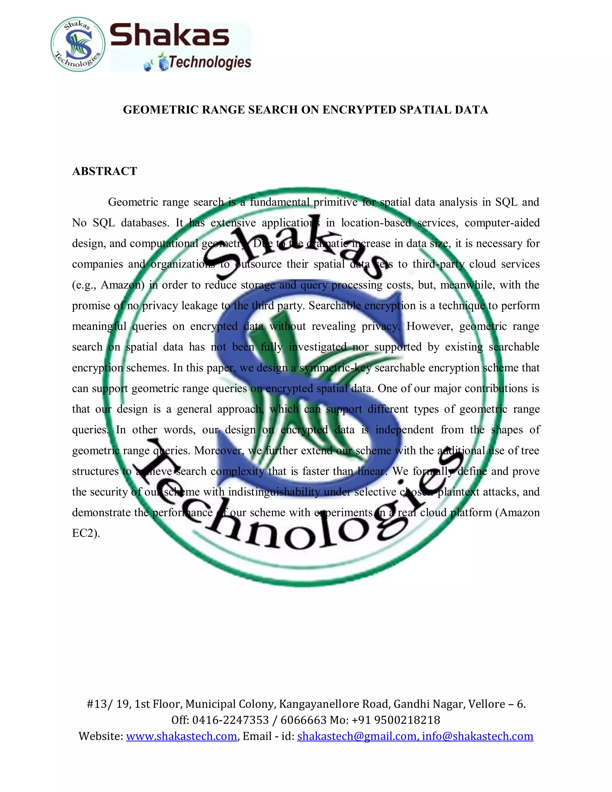 This document discusses a novel symmetric-key searchable encryption scheme designed to support geometric range queries on encrypted spatial data, addressing a gap in current research that primarily focuses on common SQL queries. The proposed solution allows a semi-honest cloud server to perform queries without compromising the privacy of the data or the queries, with improved search efficiency through the use of tree structures. The scheme is applicable in various fields, including location-based services, while providing strong privacy guarantees for sensitive spatial data.