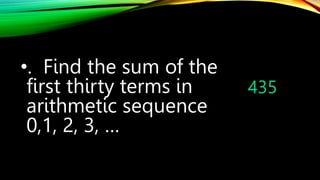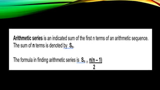 This document discusses geometric sequences. It defines a geometric sequence as a set of terms where each term after the first is obtained by multiplying the preceding term by a fixed number called the common ratio. The common ratio is the number each term is multiplied by to obtain the next term in the sequence. The document provides examples of geometric sequences and how to identify the common ratio. It explains that a geometric sequence can be described by giving the first few terms or providing the formula for calculating any term.