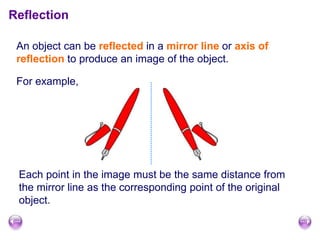 The document explains the concept of reflection in geometry, detailing how to reflect shapes across a mirror line or axis. It covers various methods of reflecting shapes, such as using paper folding and tracing paper, along with providing coordinate grid examples for specific points. The reflections maintain congruence between original shapes and their mirrored images.