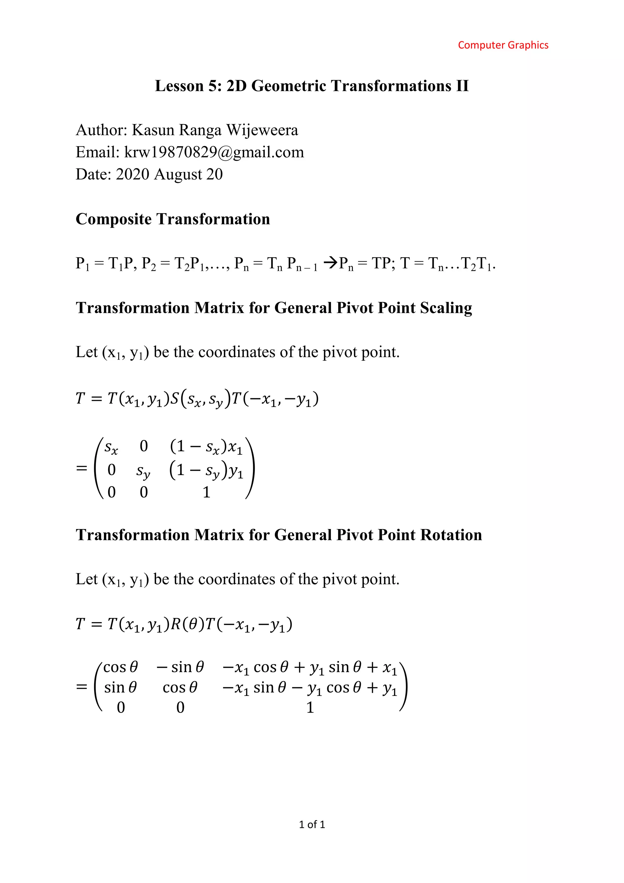 This document discusses 2D geometric transformations, including composite transformations where multiple transformations are applied sequentially as Pn = Tn...T2T1, and transformation matrices for general pivot point scaling and rotation. Scaling and rotation transformations are defined using matrices where the pivot point (x1, y1) is specified. Composite transformations allow multiple basic transformations to be combined into a single net transformation T.