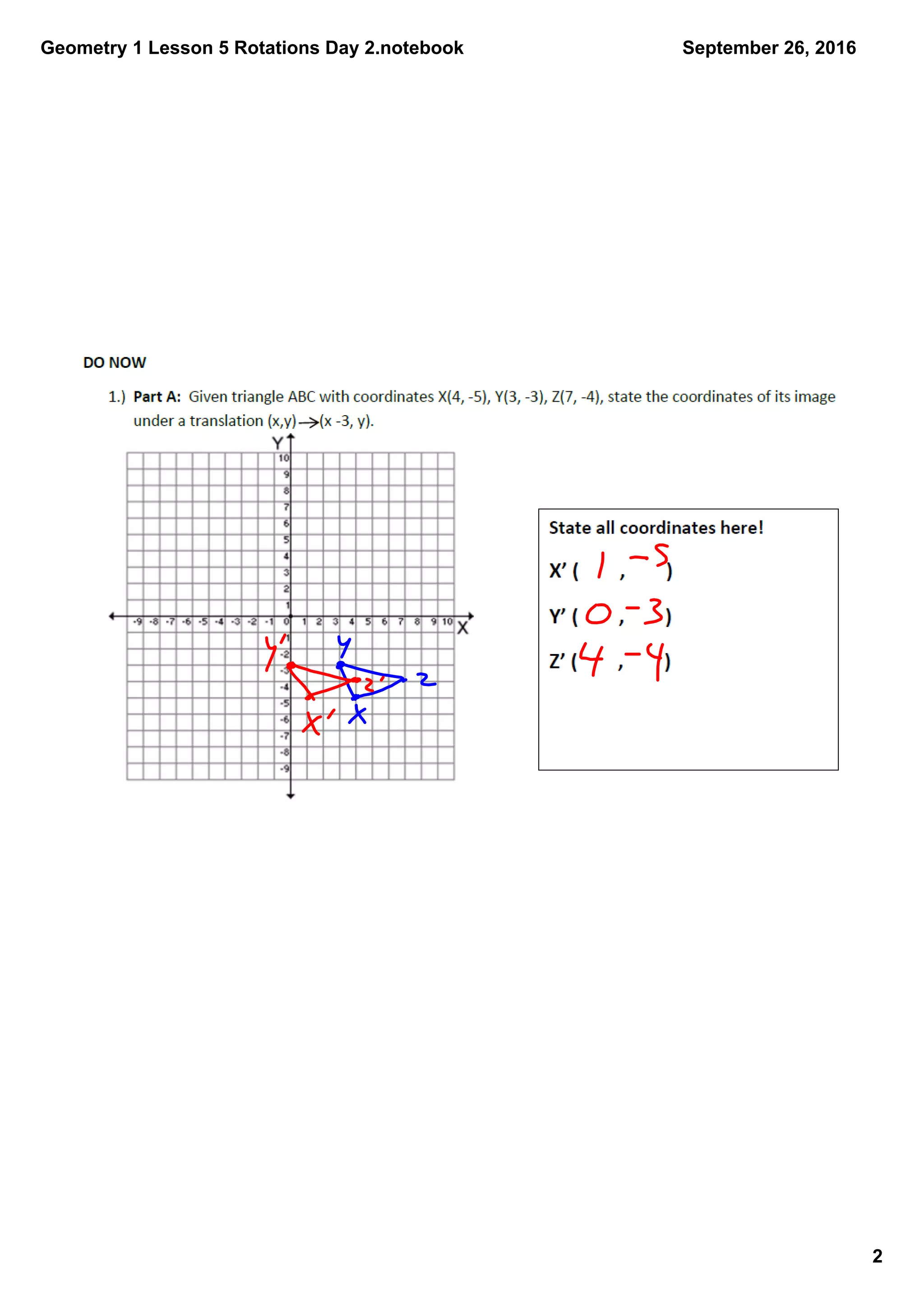 The document outlines the lesson plan for a Geometry 1 class on rotations. It includes supplemental practice problems from pages 46 through 52 to work on. A quiz over lesson 5 on rotations will take place on September 28th for A day students and September 29th for B day students. It also mentions a quiz review handout will be provided.