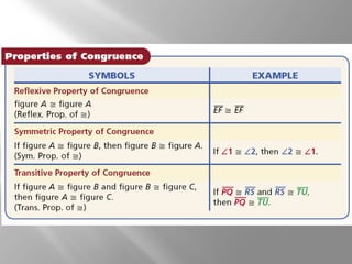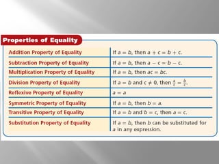 This document discusses reasoning in algebra and geometry. It provides examples of solving equations with justifications for each step. Example 1 solves the equation 4m - 8 = -12. Example 2 solves the application problem of converting between Celsius and Fahrenheit. Example 3 solves an equation involving geometry segment lengths. Example 4 identifies properties of equality and congruence that justify statements. The document emphasizes writing justifications for each step in solving equations and identifying properties. It notes that geometry uses similar properties of equality as algebra.
