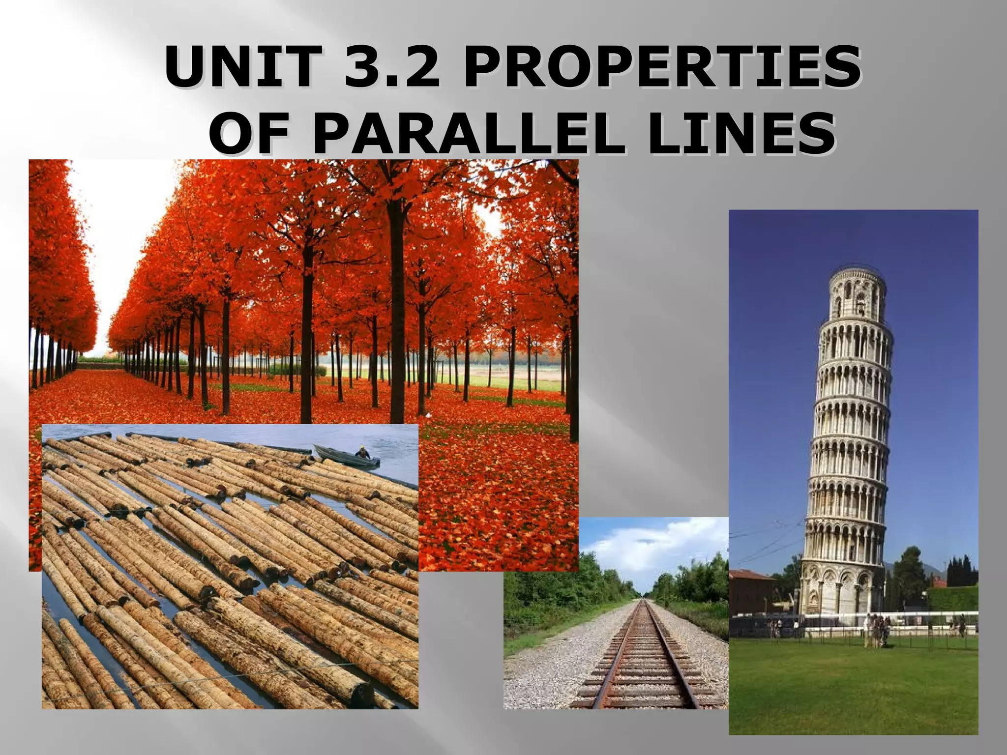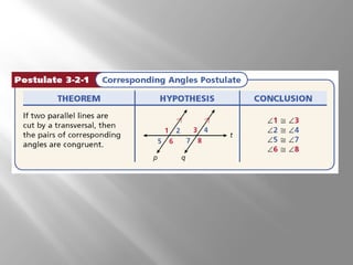 This document discusses properties of parallel lines and angles formed when lines are cut by a transversal. It defines key angle terms such as corresponding angles, alternate interior angles, and alternate exterior angles. Examples show how to use postulates and theorems about parallel lines to calculate unknown angle measures. Theorems addressed include the corresponding angles postulate and theorems about alternate interior and exterior angles. The document provides examples finding specific angle measures and asks students to identify the theorem or postulate used in different problems.