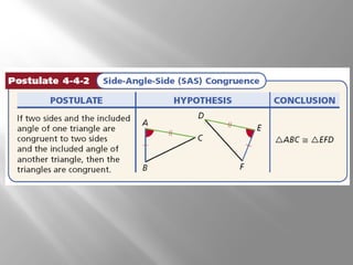 This document provides instruction on proving triangle congruence using the Side-Side-Side (SSS) and Side-Angle-Side (SAS) postulates. It includes examples of using SSS and SAS to show that triangles are congruent, as well as practice problems for students to verify congruence. Key concepts covered are triangle rigidity, included angles, and applying SSS and SAS to real-world geometry problems.