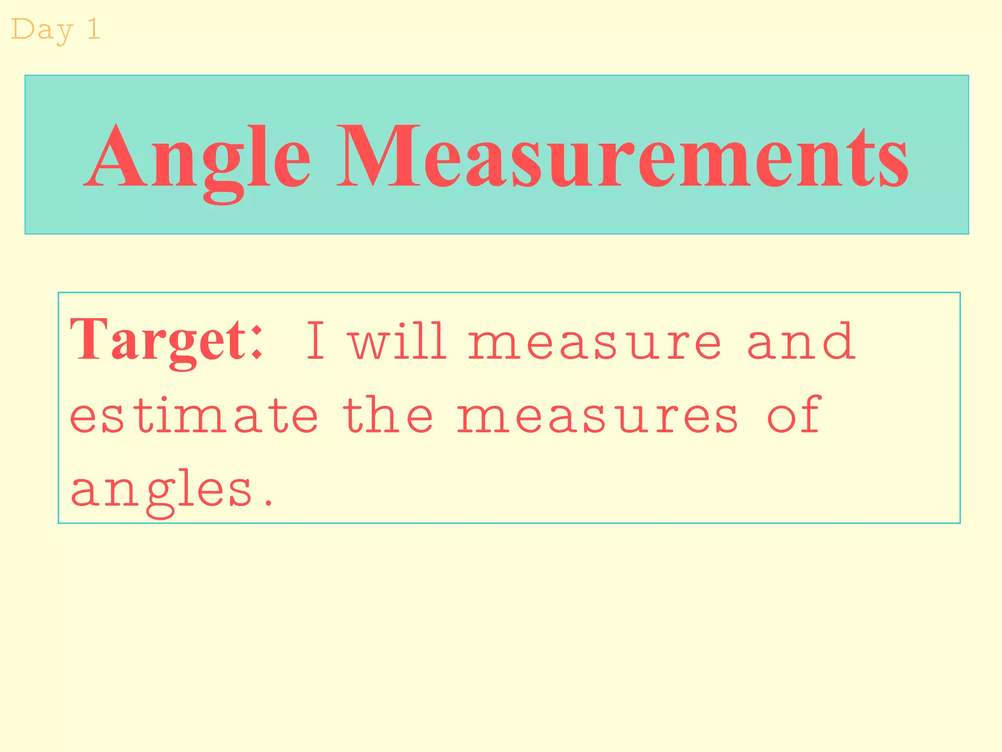 This document outlines a student's geometry learning targets and activities over several days. It introduces angle measurements using a protractor and defines acute, right, and obtuse angles. Special angle types like vertical, complementary, and corresponding angles are defined. Rules for angles formed by parallel lines and transversals are developed. Activities explore the sum of interior angles in triangles and polygons.
