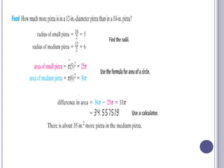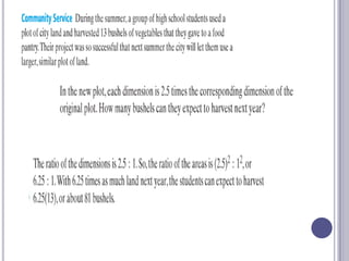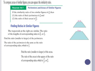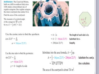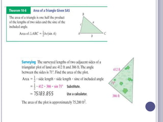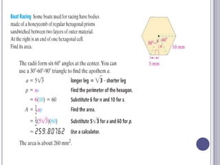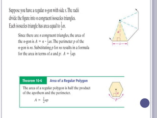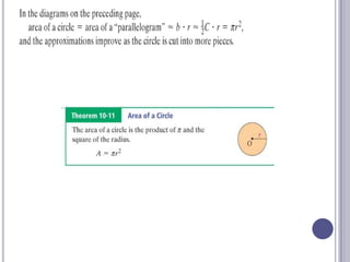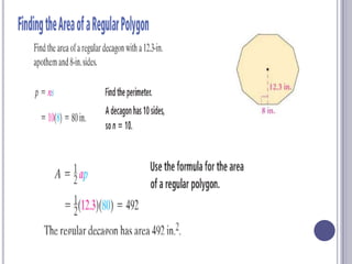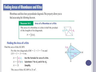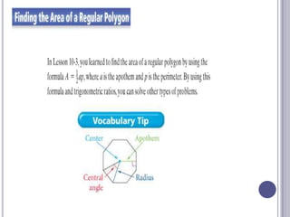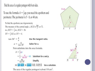 This document outlines 8 chapters that cover different topics in calculating areas of geometric shapes like trapezoids, rhombuses, kites, regular polygons, similar figures, using trigonometry, circles, sectors, and geometric probability. The chapters progress from calculating areas of basic shapes to more complex figures using formulas, trigonometry, and probability.