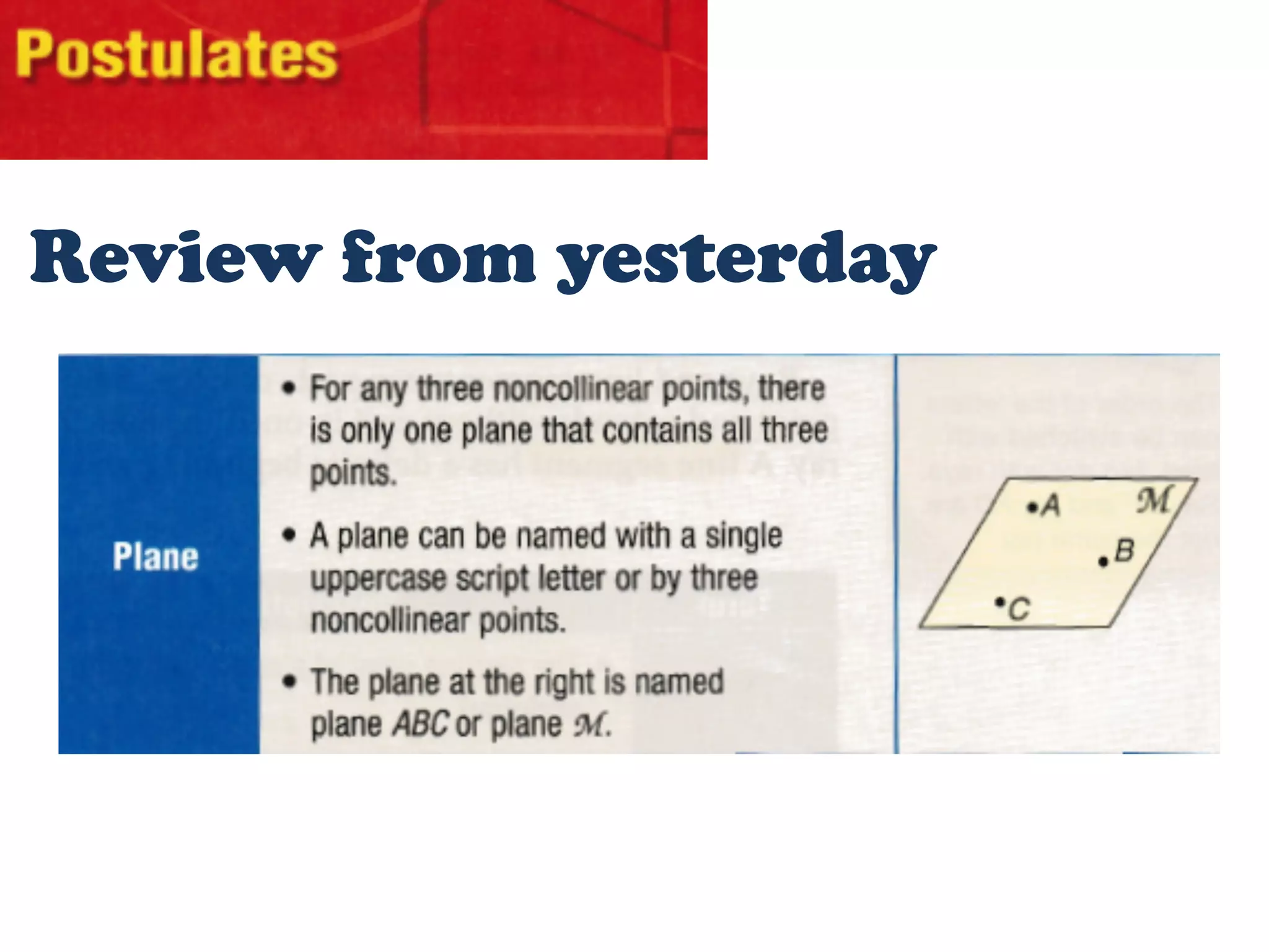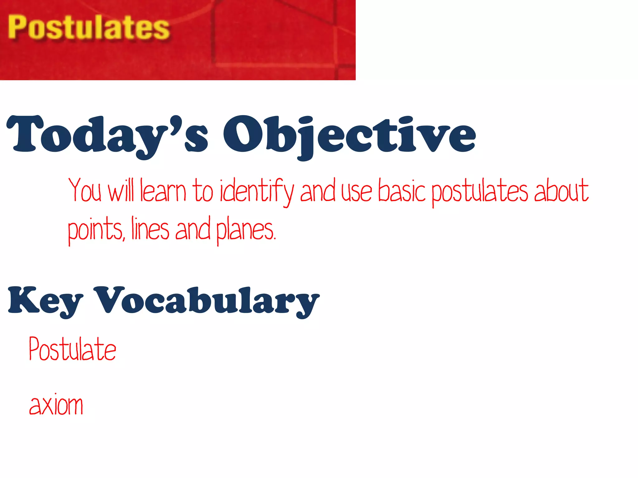 Today you will learn to identify and use basic postulates about points, lines and planes. A postulate is a statement made in geometry that is accepted as true without proof, such as statements about points, lines and planes. This builds on yesterday's review of geometry concepts.