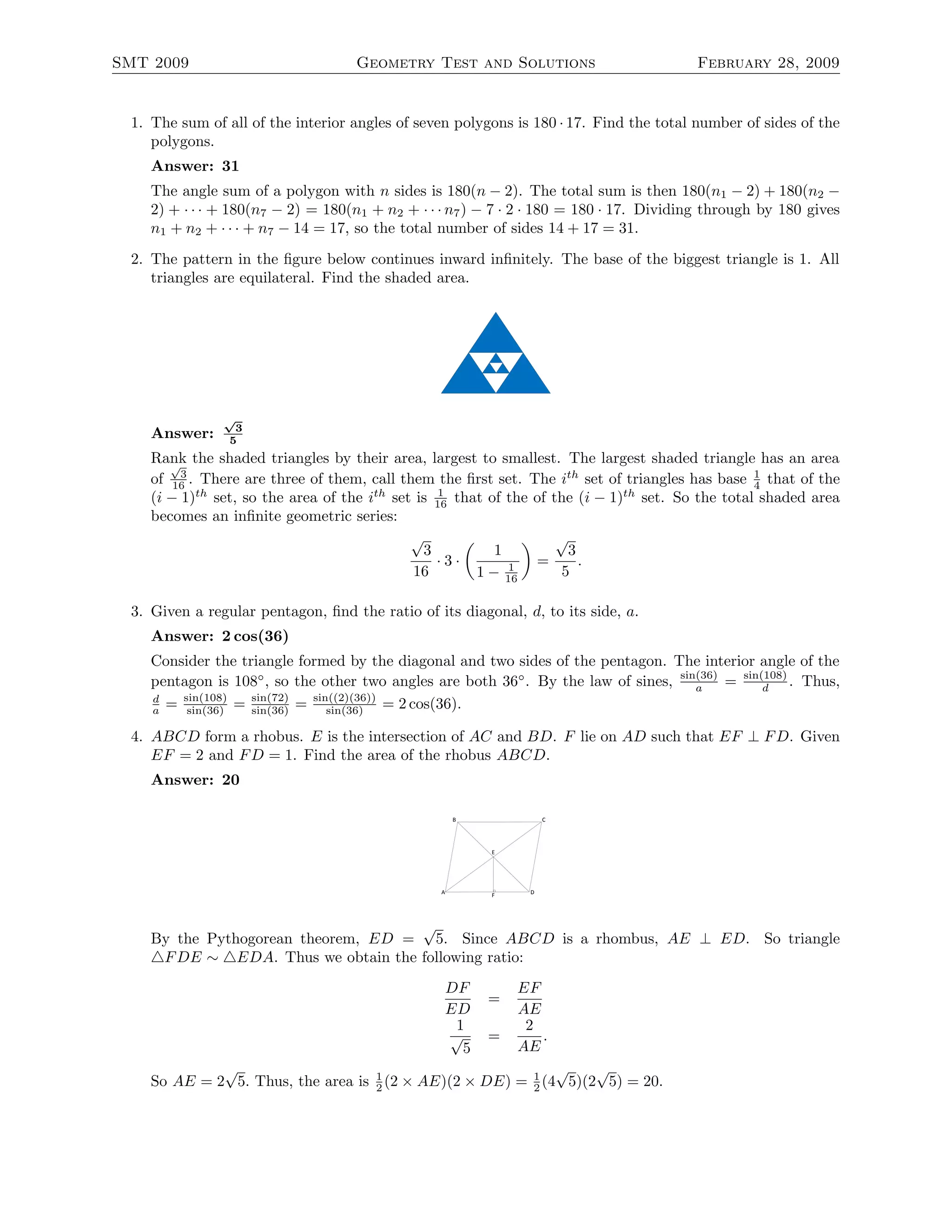 The document contains 10 geometry problems with solutions. Problem 1 asks about the total number of sides of seven polygons given the sum of their interior angles. Problem 2 asks about the shaded area of an infinitely repeating pattern of equilateral triangles. Problem 3 asks about the ratio of the diagonal to the side of a regular pentagon.